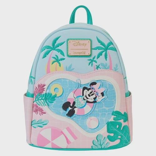 Take a trip to The Minnie Mouse Motel with this Minnie Mouse Vacation Style Mini-Backpack! The faux leather mini-backpack features applique, embossed, embroidered and printed details of Minnie lounging in the pool, surrounded by palm trees, chaise lounges and umbrellas. The cute and collectible mini-backpack measures approximately 10 1/2-inches tall x 9-inches long x 4 1/2-inches wide. For ages 15 and up.